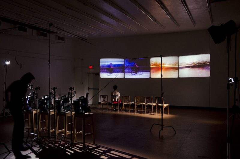 During projection the captured space is re-composed into a panorama, with the cyclist perpetually moving through. Because of the instability of film mechanics -16mm projectors do not run exactly at 24 frames per second, I constantly monitor the machines -turning the projectors on and off, to maintain the integrity of the film loop.